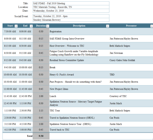 The fall 2019 meeting was held on October 23rd at TEC Materials Testing in Knoxville, TN.